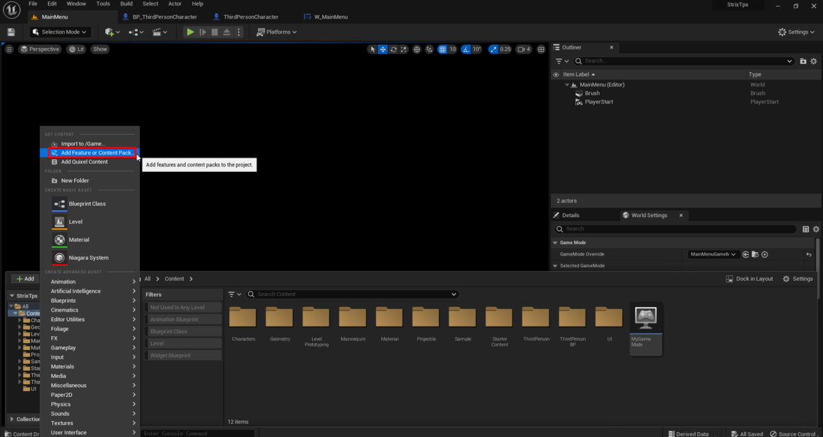 まずはAdd→Add Feature or Content Packを選んでUE5のTherdPersonを追加します。